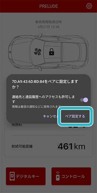 ペア設定リクエストポップアップの「ペアに設定して接続」をタップ。