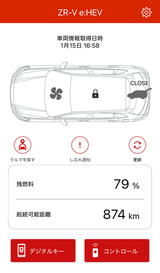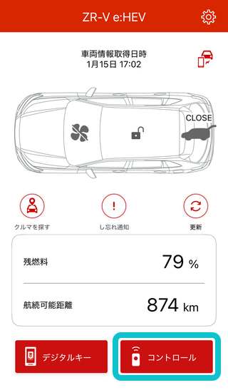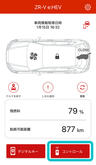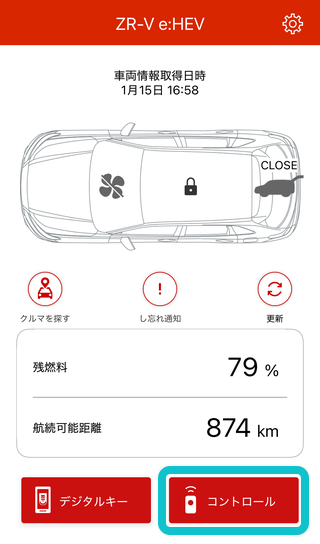 Honda リモート操作アプリを起動し、TOP画面から「コントロール」をタップ。