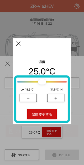 温度調節バーを左右に動かす、または“ー”、“+”をタップし、設定温度を変更し、「温度変更する」をタップ。