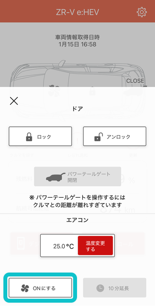 ※一般公道ではHonda リモート操作アプリのエアコン操作のご利用はしないでください。道路交通法違反となる場合があります。 ※地域により車両の停止中にみだりにエンジンを始動させた場合、条例により罰則を受ける場合がありますのでご注意ください。