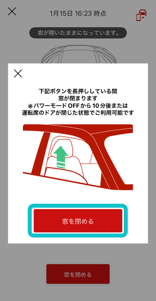 窓を閉めるときはボタンを長押ししてください。※Honda リモート操作でのエアコン稼働中は、し忘れ画面でのドアロック操作ができません。 ※窓閉め忘れは、Bluetooth接続圏外のときは操作できません。 ※パワーモードがONの場合、窓閉め操作は作動しません。 ※車内にHonda スマートキーがあると操作できません。