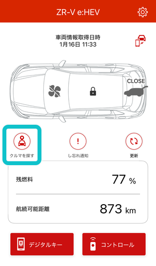 Honda リモート操作アプリを使って、車両の現在の位置を地図上で確認し、ハザードの点滅やブザーを鳴らすことができます。 広い駐車場でクルマが見当たらないときなどに便利です。