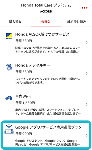 通信プランは、Honda Total Careアプリ、会員サイトもしくは車内のディスプレーから追加オプションとしてご購入いただけます。