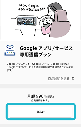 Google アプリ/サービス専用通信プラン詳細ページ下の「申込む」をタップ。