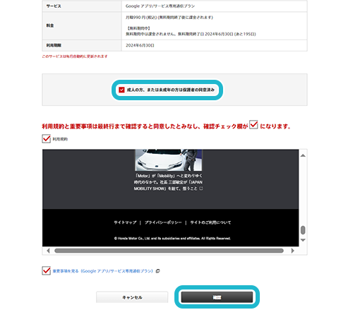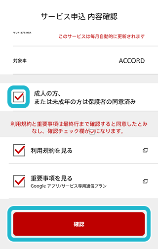 サービス内容及び利用規約、重要事項をよくお読みいただき、問題なければ「成人の方、または未成年の方は保護者の同意済み」にチェックし、「確認」をタップ。