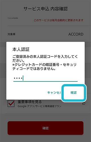 Honda Total Care会員サイトまたはHonda Total Careアプリに登録済の本人認証コード4桁を入力し、「確認」をタップ。