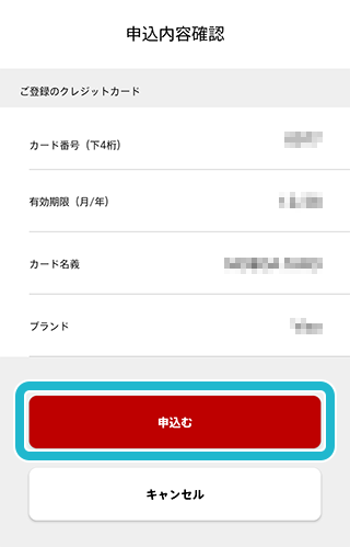 確認画面にて情報に誤りがないか確認し、問題なければ「申込む」をタップ。
