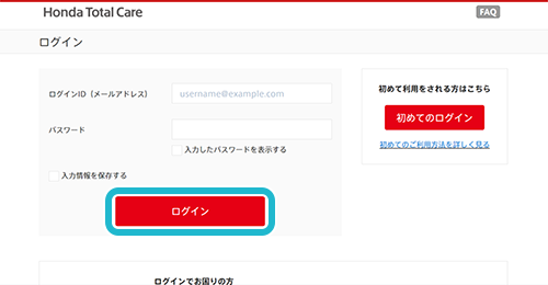 会員サイトへアクセスし、ログイン画面にHonda Total CareのIDとパスワードを入力、「ログイン」をクリック。