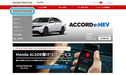 会員サイトメニューの「クルマとつながる」タブの「Honda Total Care プレミアム」をクリック。