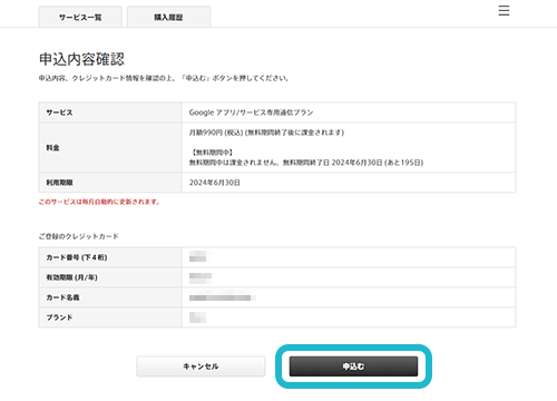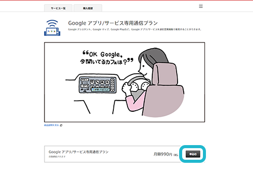 Google アプリ/サービス専用通信プラン詳細ページ下の「申込む」をクリック。