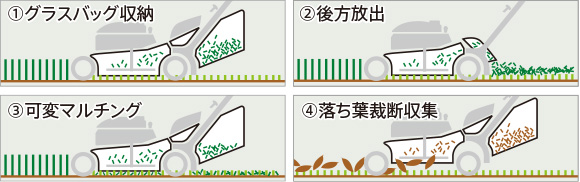 ブレードの交換や部品を追加で装着することなく、収草から後方放出、マルチングなど幅広い作業が行なえます。