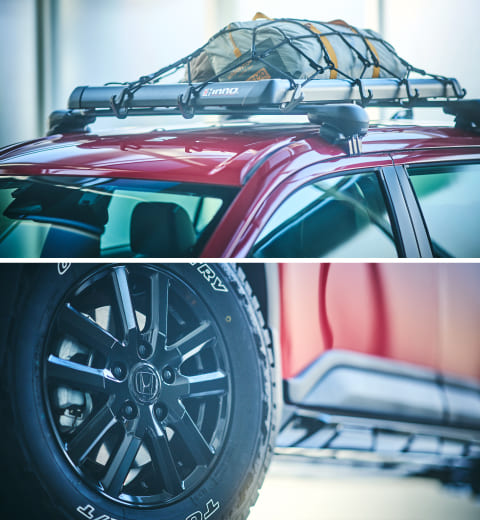 大西 そうなんです! WR-Vってカクカクしていて、ゴツさとかタフネスみたいな雰囲気がベースのデザインにあるので、そこを引き伸ばすようなイメージで考えました。 そして気軽にカスタマイズ出来るレベルで。具体的には『グリル周り(顔の部分)』と『ルーフキャリアの装着(既製品)』と『タイヤとホイール』ぐらいなんです。そこにTOUGH STYLEとしてラインナップしている純正アクセサリーをブラックアウトして装着しています。グリルなど細かい部分とのトータルでのカラーコーディネートにも気を配っています。
