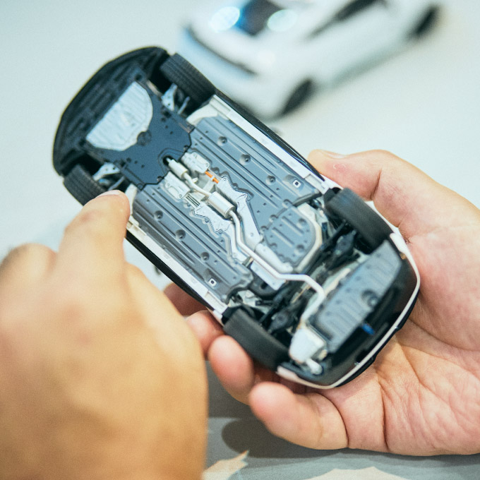石黒さん 実車を開発されたみなさんの想いやお話を聞いていたので、熱意に応えたくて頑張りました(笑顔)。でも一番大変だったのは下回り。模型開発の初期段階では実車もないので苦労しました。あと、タミヤの模型は塗り分けの作業が面倒にならないように、部品を出来る限り分割して成形しているのですが、実車がないと詳細の色分けが分からなくて、ここも大変でした。その都度、実車の開発者と直接やり取りするのも、実は初めてのことでした。