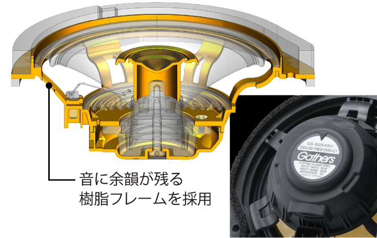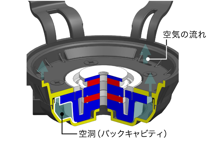 環境に左右されにくい性能を維持するために、構造の観点でもアプローチしており、いつでもどのクルマでも私たちの設計した音が楽しめます。例えば、スピーカーの内部にあえて空洞と空気の通り道をつくり、狙いの音域がノイズにかき消されないようにうまく共鳴させることで、クルマが停まっているときでも、走っているときでも変わらずに、しっかりと私たちが設計した音が聴こえるようにしています。