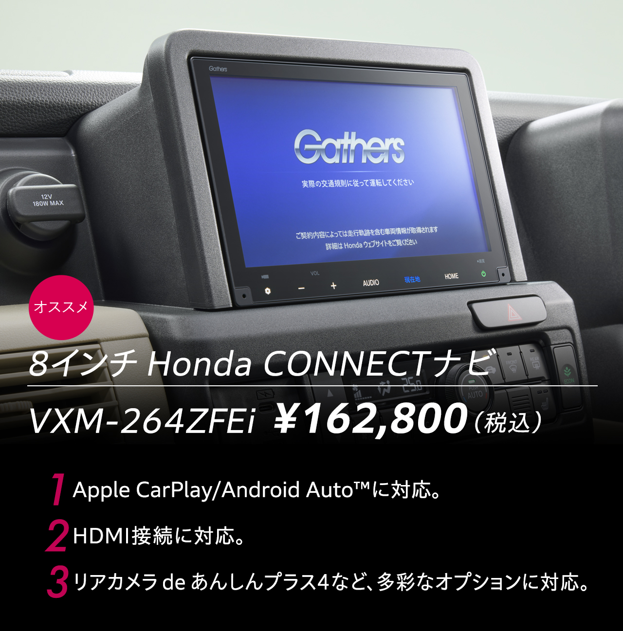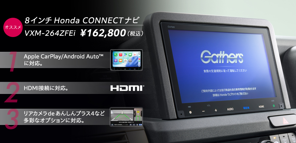 ※ギャザズナビゲーション・オーディオ以外を装着した場合、動作の保証は致しかねます。※VXM-264ZFEi/245ZFEiを装着した場合、地上デジタルTVは2アンテナ仕様となります。別途、下記「デジタルTV用フィルムアンテナ(12セグ+ワンセグ放送用 2ch)」を装着することで、4アンテナ仕様となります。また、裏サーチが追加機能として利用できます。※音声認識スイッチは、VXM-245ZFEiは利用できません。※[e:L2]にはステアリングスイッチノブ(オーディオ)、ハンズフリーテレホン&音声認識スイッチは装備されません。