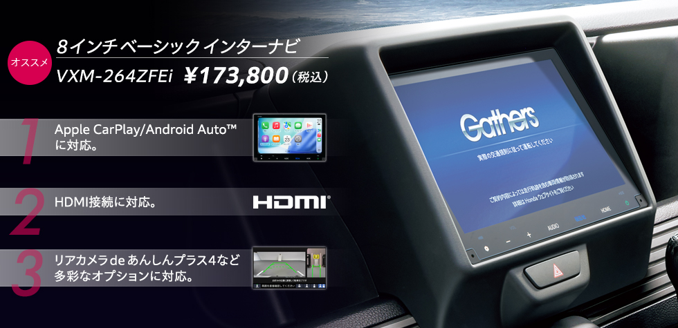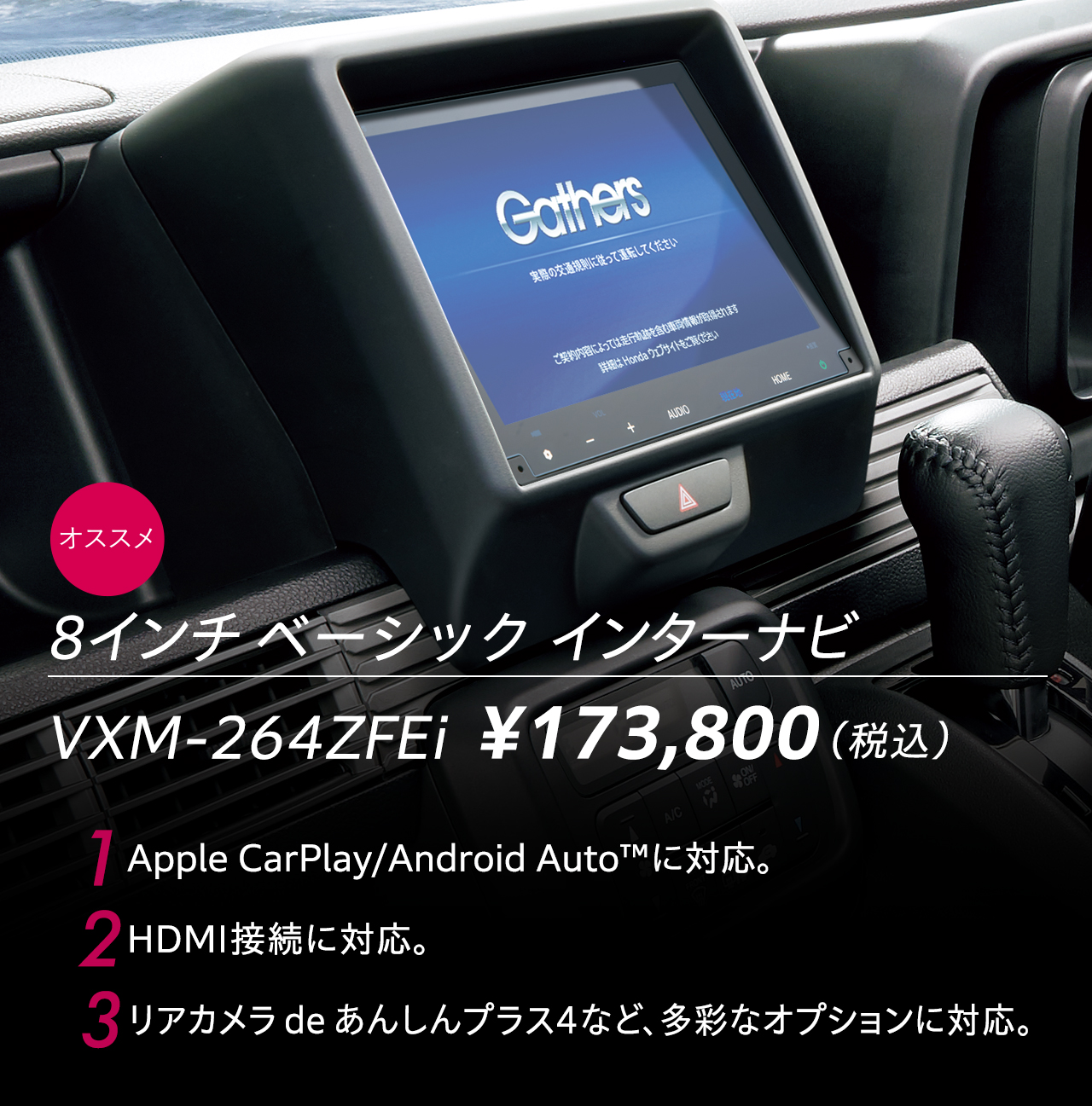 ※ギャザズナビゲーション・オーディオ以外を装着した場合、動作の保証は致しかねます。※VXM-264ZFEi/245ZFEiを装着した場合、地上デジタルTVは2アンテナ仕様となります。別途、下記「デジタルTV用フィルムアンテナ(12セグ+ワンセグ放送用 2ch)」を装着することで、4アンテナ仕様となります。また、裏サーチが追加機能として利用できます。※音声認識スイッチは、VXM-245ZFEiは利用できません。