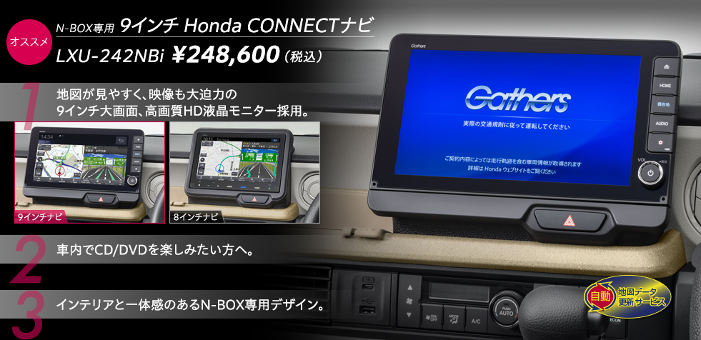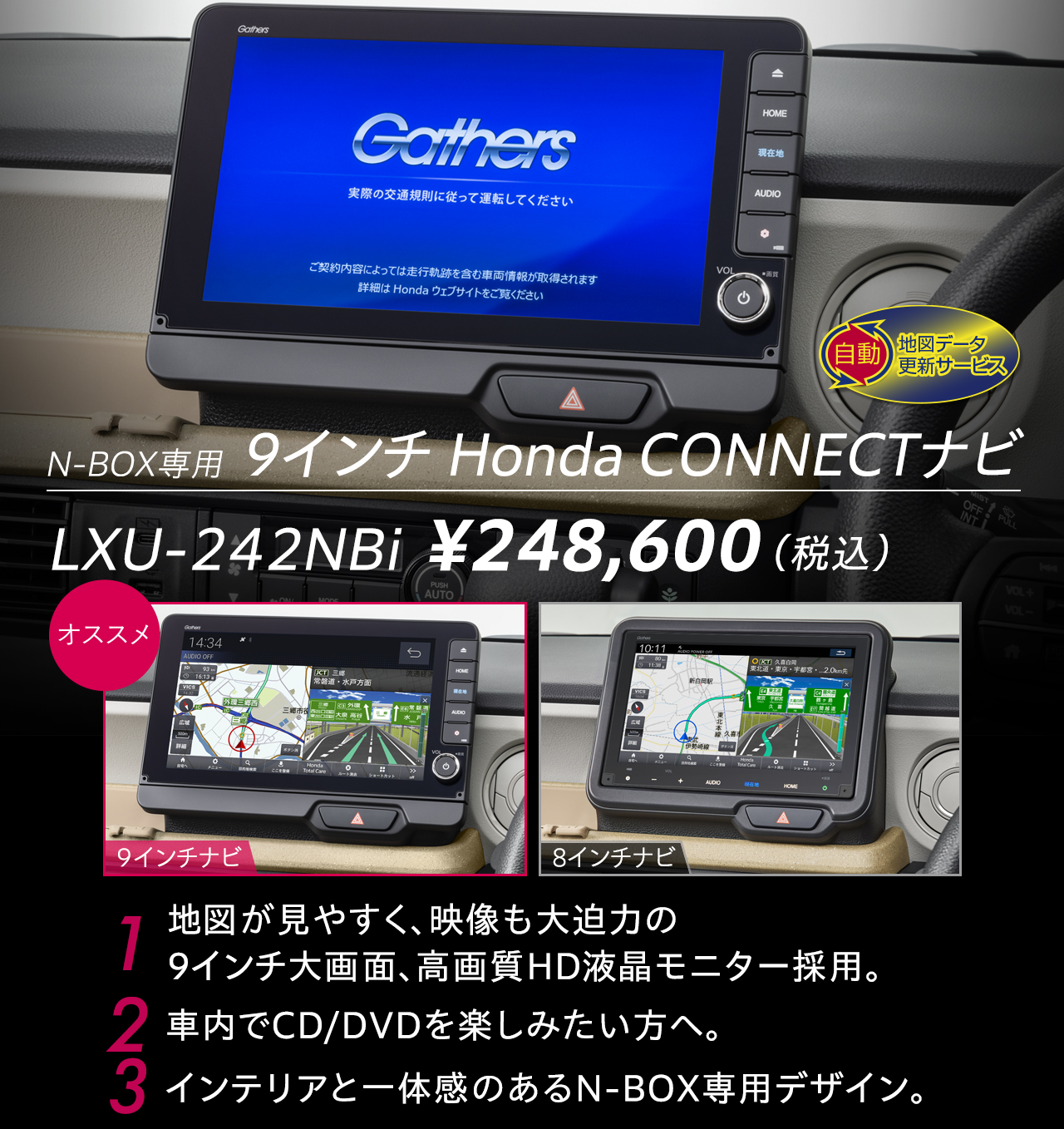 ■リアワイドカメラ ■オーディオリモートコントロールスイッチ ■ハンズフリーテレホンスイッチ/音声認識スイッチ ■4スピーカー(N-BOX、N-BOX JOY)/ 6スピーカー(N-BOX CUSTOM) ※スピーカー数は標準装備のスピーカー数との合計 ■デジタルTV用プリントアンテナ(12セグ/ワンセグ) ■専用ワイヤーハーネス
