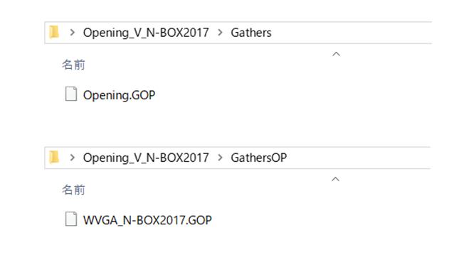 5.「Gathers」フォルダの中にOpening.GOPファイルが生成されていることを確認してください。「GathersOP」フォルダの中にWVGA_***.GOPファイルが生成されていることを確認してください(***はFITなどの名前が入ります)。