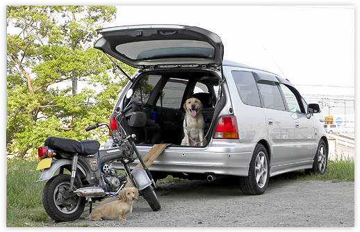 子供達も大きくなり、その年月と共に使用状況は変貌を遂げ、近年は休日にバイクや釣えさを積まされ?知らない街の散策や、釣りを楽しむ趣味相棒となりました。ワンコ達も大好きな車で、油断をすると勝手に乗り込まれてしまいますが、写真に写っているような得意顔にいつも負けてしまいます。